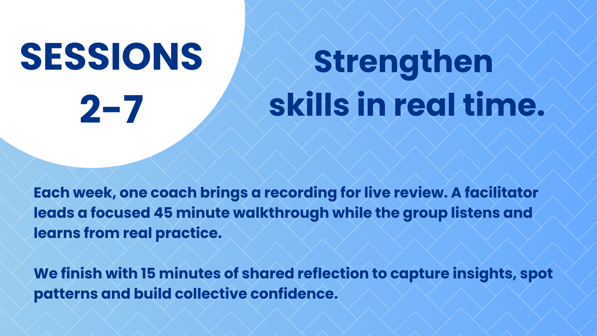 Live real time coaching practice in a supportive group of six coaches in similar positions, all looking to both contribute and learn